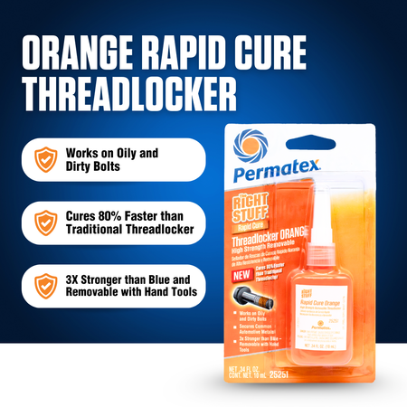 Directions: 1. Clean and dry parts using Permatex Surface Prep activator. 2. Shake threadlocker before each use. 3. Remove cap and snip nozzle tip. 4. Apply to threaded areas and assemble parts. Refer to Technical Data Sheet for complete information. NOTE: Threadlocker is for use on active metal parts and is not to be used on plastics.
